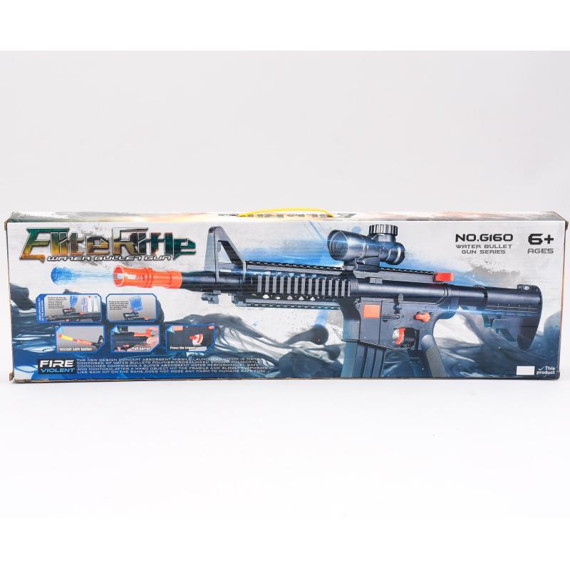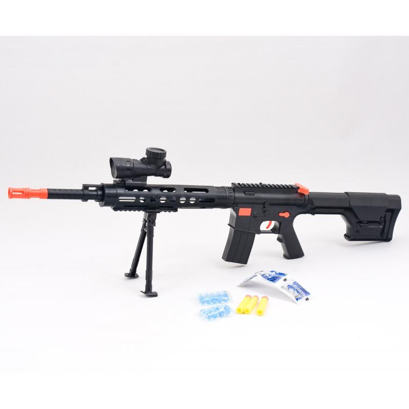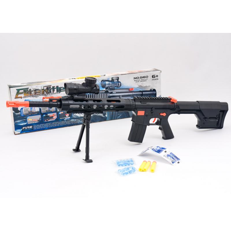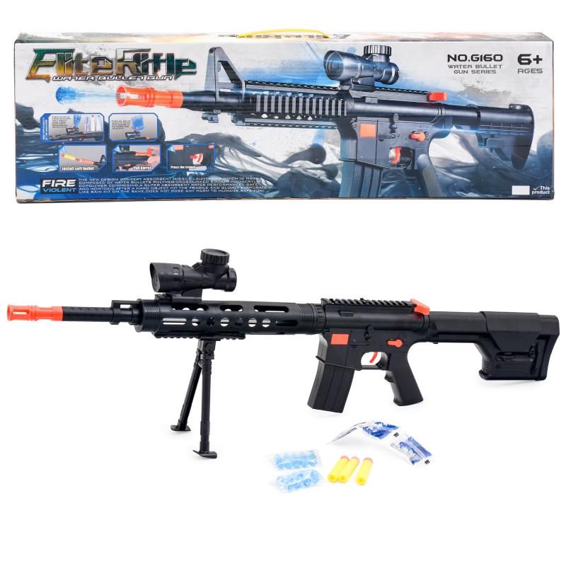 Каждый мальчишка желает быть сильным и крутым, защищать друзей и маму, поэтому любит играть не только с машинками и роботами, а также с игрушечным оружием. Автомат с прицелом, водяными пулями и пулями-присосками в комплекте. Длина игрушки 60,5 см.