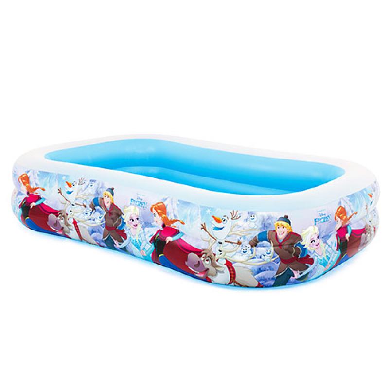Бассейн выполнен в прямоугольной форме, по периметру которого нанесены изображения персонажей диснеевского мультфильма «Frozen». Изготовлен такой бассейн из высококачественного винила с толщиной стенок 0.32 мм. Его дно не надувное, поэтому бассейн необходимо устанавливать на ровной поверхности, чтобы предотвратить его переворачивание. Вместительность воды 796 л при заполнении бассейна на 80 %. При помощи специального клапана воду можно легко слить. В данной модели отсутствует возможность подключения фильтр-насоса.