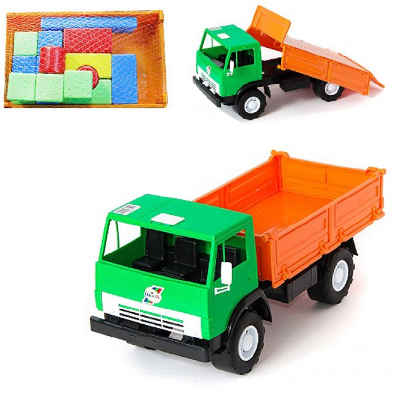 Игрушечный грузовик имеет яркое сочетание цветов: зеленая кабина и оранжевый кузов на черном шасси с колесами. Все детали подвижны, а борта кузова легко открываются. Такая функция еще больше приближает игрушечную спецтехнику к оригинальной. И, кроме того, помогает развить у ребенка мелкую моторику. Автомобилем можно играть как в песочнице, так и дома. В комплекте идут кубики в качестве груза.