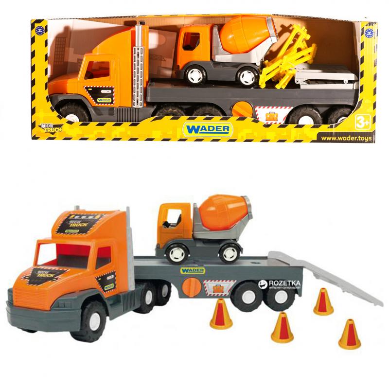 Вантажівка з платформою та автоміксер, дорожні конуси в наборі..