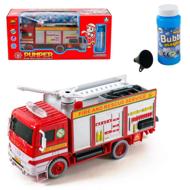 Машинка издает звуки, светится, пускает мыльные пузыри, работает от пальчиковых батареек, которые не входят в комплект. Интересный оригинальный дизайн, красно-серая окраска, а также наличие в наборе мыльных пузырей - все это делает игрушечный набор чрезвычайно интересным, привлекательным и желанным для каждого малыша.Пожарная машина изготовлена из качественного и прочного пластика, который абсолютно безопасен для здоровья.Мыльные пузыри будут дарить еще больше ярких и положительных эмоций. Малыш будет развивать воображение, фантазию, расширит представление о профессии пожарного.