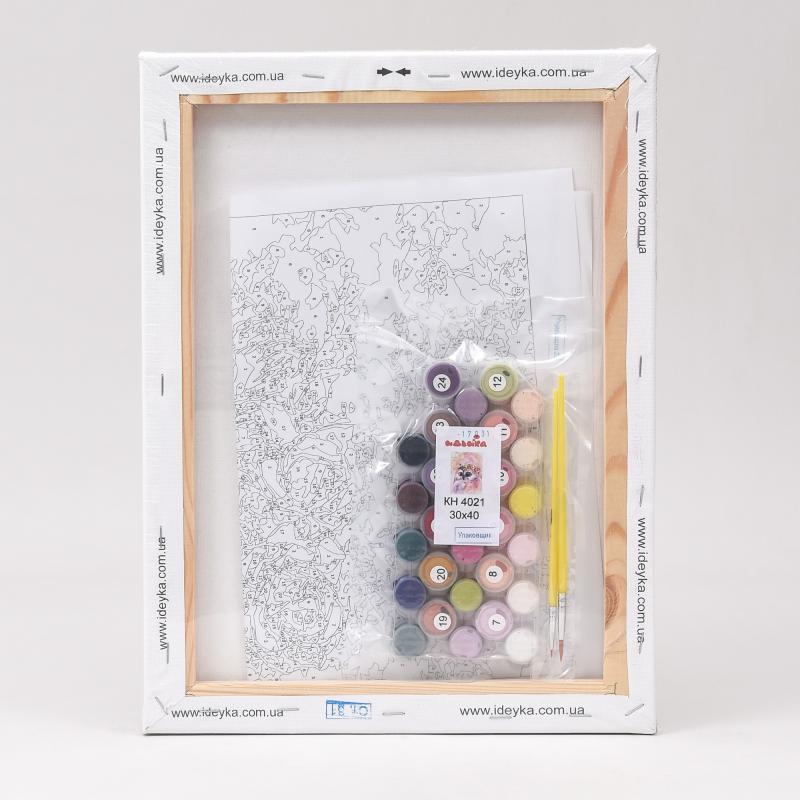 В наборе: холст, набор акриловых красок, кисточки, лист-подсказка, инструкция.