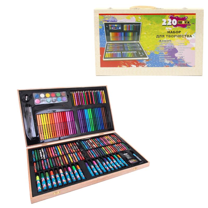 Комплектація - 220 предметів: фломастери, маркери, фарби, воскові, кольорові олівці, листи А4, палітра та інше канцелярське приладдя для малювання.