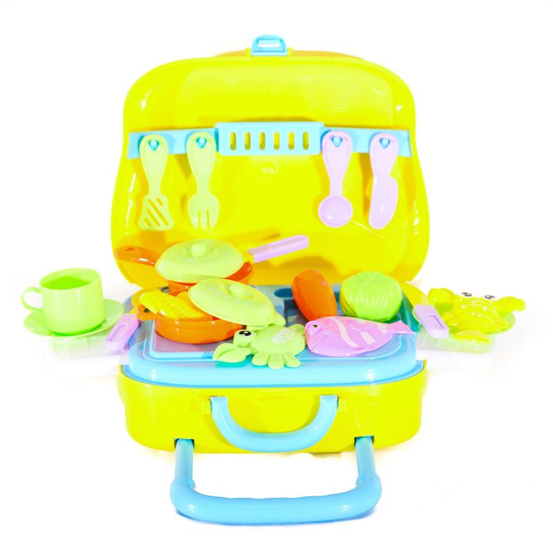 Этот симпатичный чемодан на колёсиках – настоящая находка для маленькой хозяюшки, которая любит готовить вне дома! В наборе есть вся необходимая утварь (кастрюля, сковорода, вилки, ложки, лопатки), а также целый комплект аппетитных продуктов для создания кулинарных шедевров! 29 предметов.