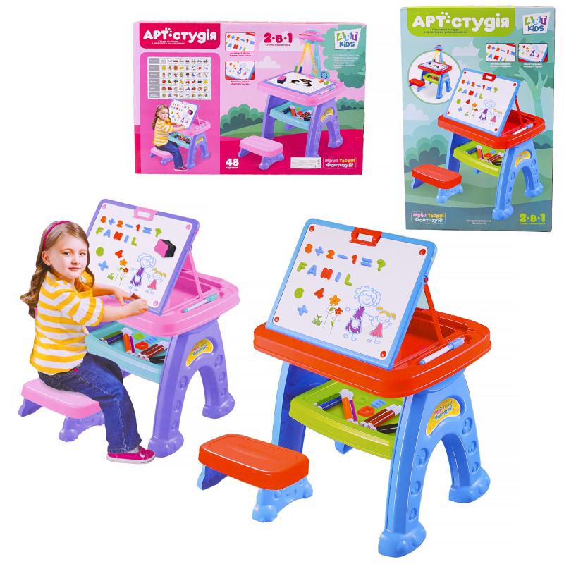 Проектор выполняет функции 2 в 1, как столик для рисования и учёбы, габариты 39х30х58 см. В комплекте стул, полочка для канцелярии, буквы (английский алфавит), цифры, маркеры, слайды с картинками (48 шт.). Доска мольберта магнитная, её можно фиксировать под углом.