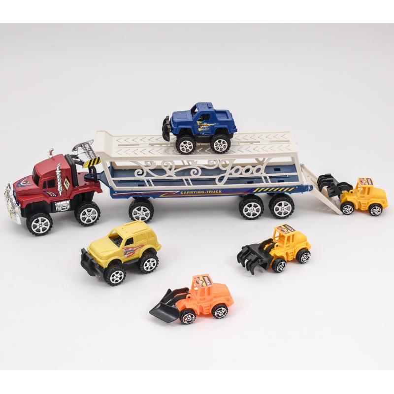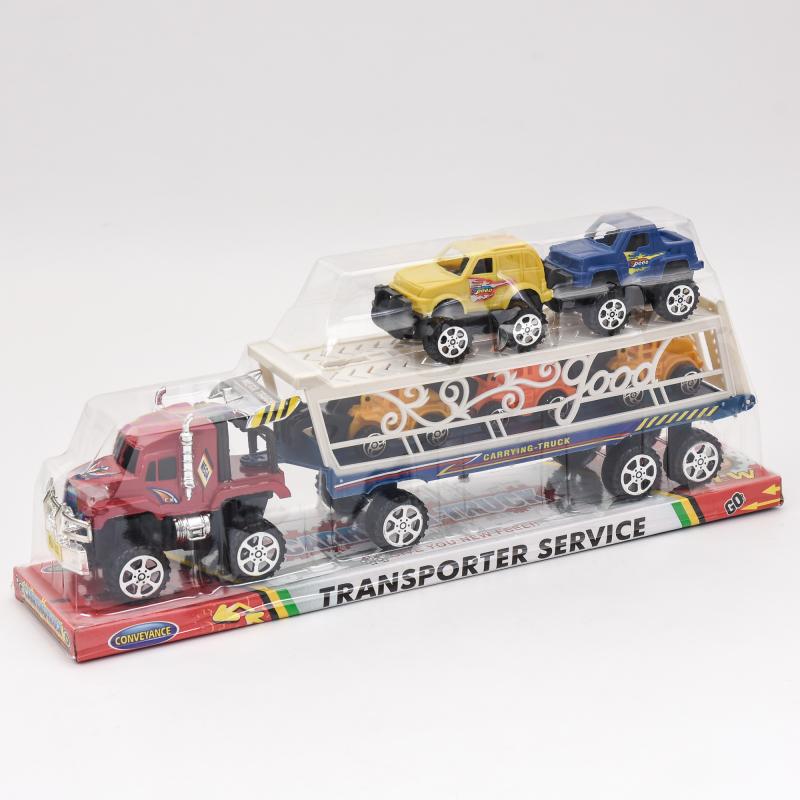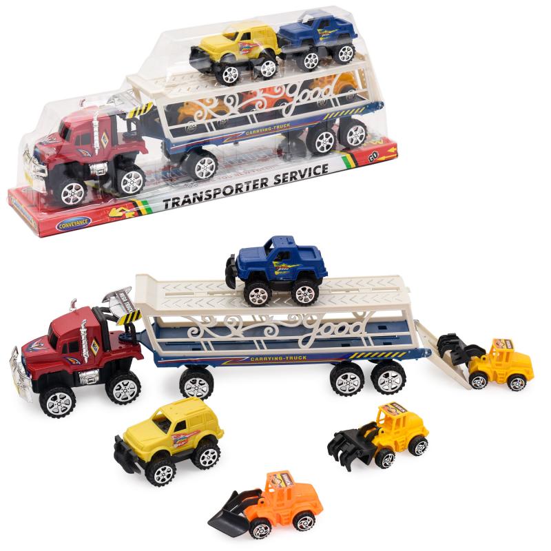 Длина трейлера 38 см, также в комплекте 5 машинок, которые размещаются на двухуровневом подвижном кузове.