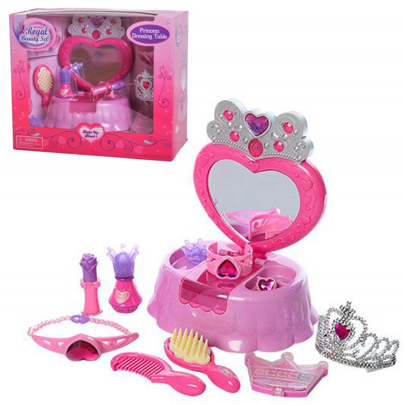 Каждая девочка мечтает быть настоящей красавицей! В её арсенале только самая яркая косметика и великолепные аксессуары. Это трюмо-шкатулка наполнено игрушечными помадой, парфюмами, расчёсками и роскошными короной и колье. Кроме того, есть место для хранения украшений. Набор, несомненно, станет изюминкой в коллекции юной покорительницы сердец!